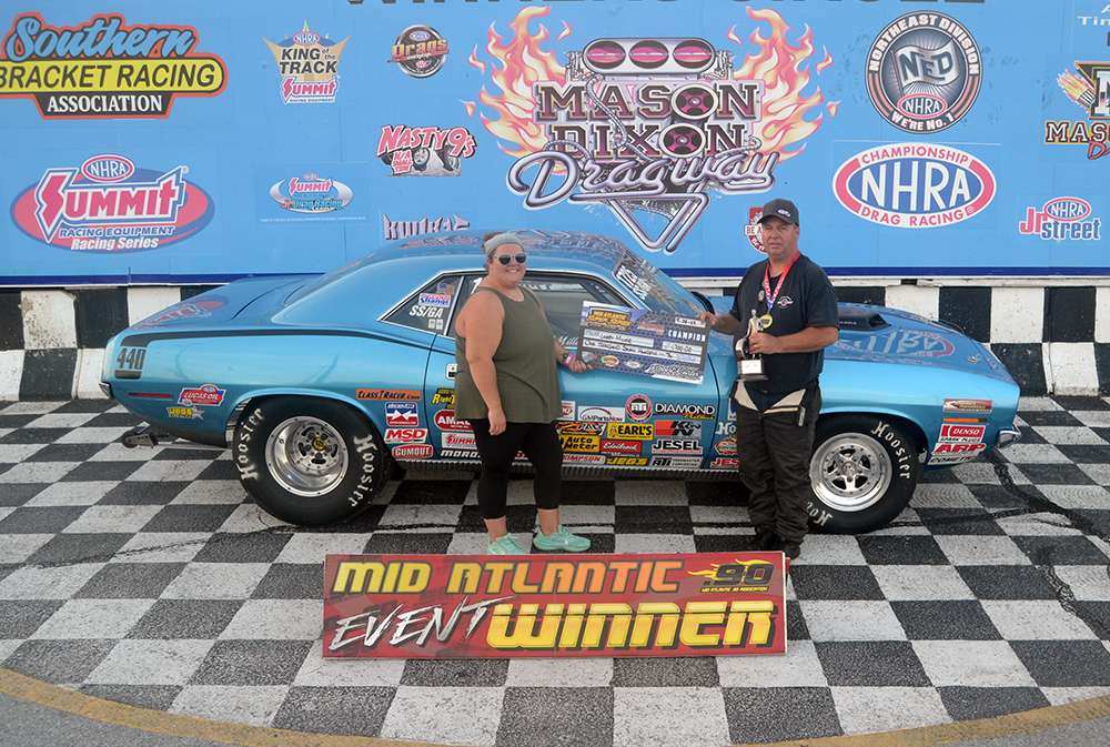 In the finals at Mason Dixon, Miller driving his big block SS/GA Barracuda was up against the GT/MA Firebird of Bill Kennedy. Both drivers had nearly identical reaction times and at the top end it was Miller with a right on a 9.88 on a 9.88 dial to Kennedy’s close 10.348 on a 10.34.