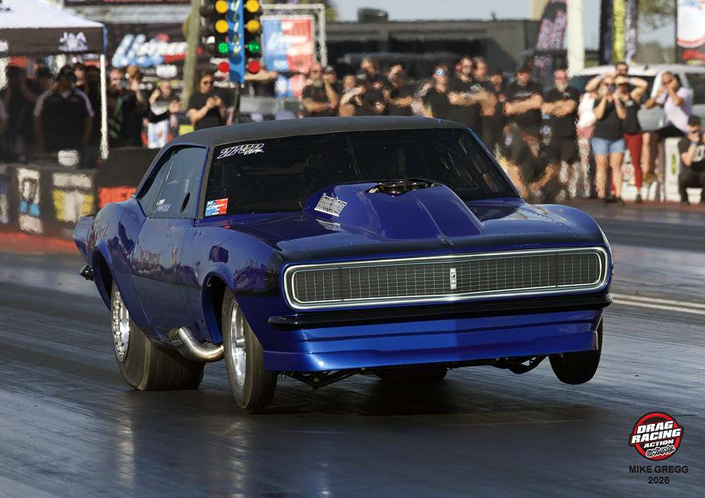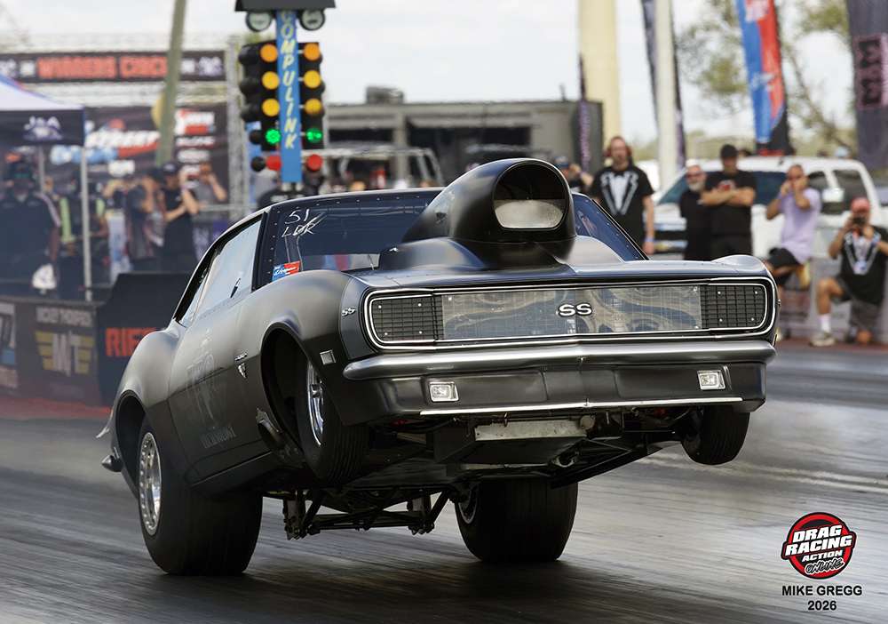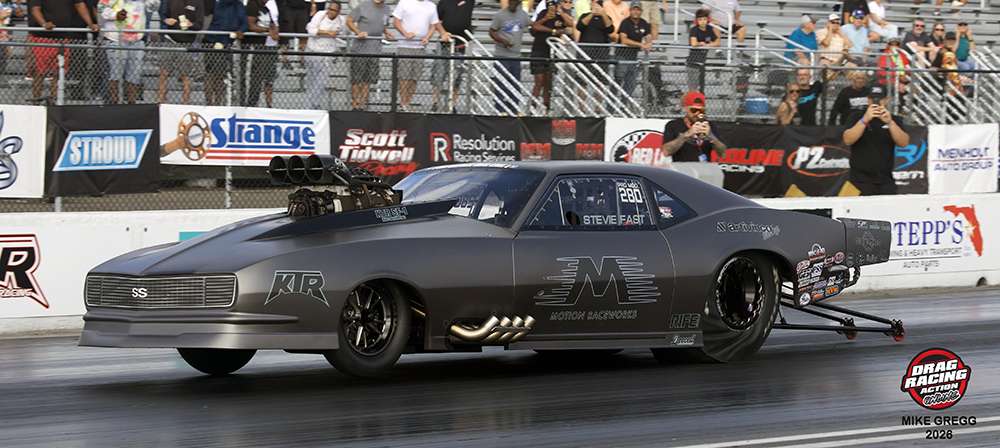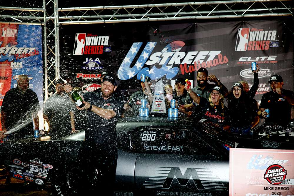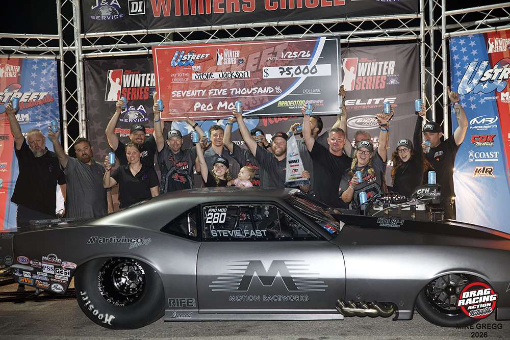 Less than a year after racing to a runner-up finish at the $150,000 2025 Drag Illustrated World Series of Pro Mod, Stevie “Fast” Jackson took his screw-blown Motion Raceworks “Shadow 3.0” ’68 Camaro to the $75,000 winner’s circle Sunday night at the U.S. Street Nationals presented by M&M Transmission. Jackson won with a 3.566-second pass at 210.80 mph after opponent Derek Menholt went red by .006 seconds on a 3.57-second pass at 211.36. By winning the second of three races in the Drag Illustrated Winter Series presented by J&A Service, Jackson moved up to second in the Winter Series points standings.