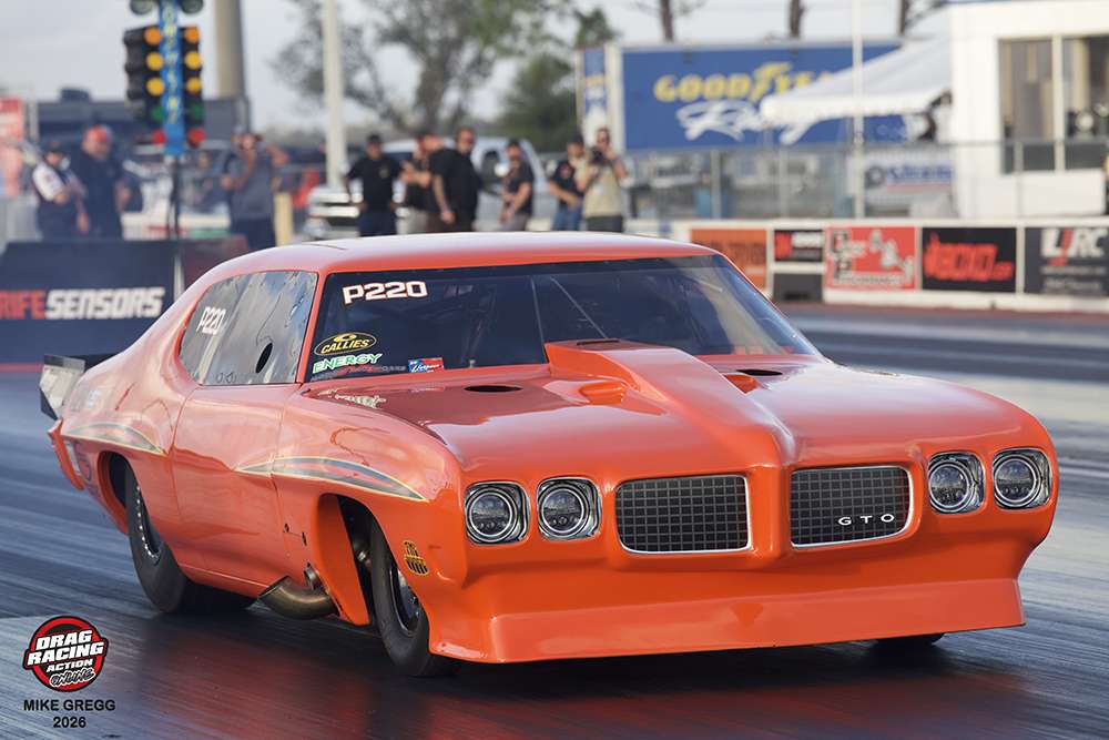 Car owner and driver Tommy Youmans rolled into Bradenton with multiple cars in his Tommy Youmans Racing camp, but it was Youmans himself and his turbocharged, Pontiac-powered ’70 GTO that parked in the winner’s circle Sunday night. After qualifying No. 8 in Limited Drag Radial, Youmans started out in the 3.90s and ended up in the mid-3.80s by the final round. He defeated Scott Husted, Brandon Carter, Jamie Stanton, and Snowbirds winner Brian Weddle to meet Justin Martin in the final round. There, Youmans left first and never looked back, running a 3.860 at 196.30. Martin coasted to an 11.817 at 41.03.