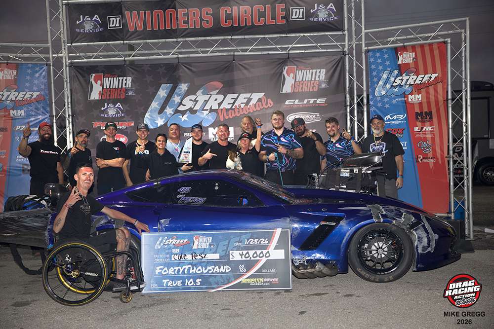 U.S. Street Nationals Winter Series victories also went to Jerry Morgano in Pro 10.5, Cole Pesz in True 10.5, and Joseph Mallais in the Strange Engineering Lil Gangstas Championship Series presented by Melling Performance. In the FuelTech Radial Outlaws Racing Series classes, Grantley Schloss (Pro 275), Tommy Youmans (Limited Drag Radial), Billy Lackey (X275), and Joel Greathouse (Ultra Street) were victorious. Ronald Procopio (4.60 Bikes), Brian Shook (6.50 Index), Jason Renninger (7.50 Index) won in the index classes, and Cailyn Fargo won in Jr. Dragster.