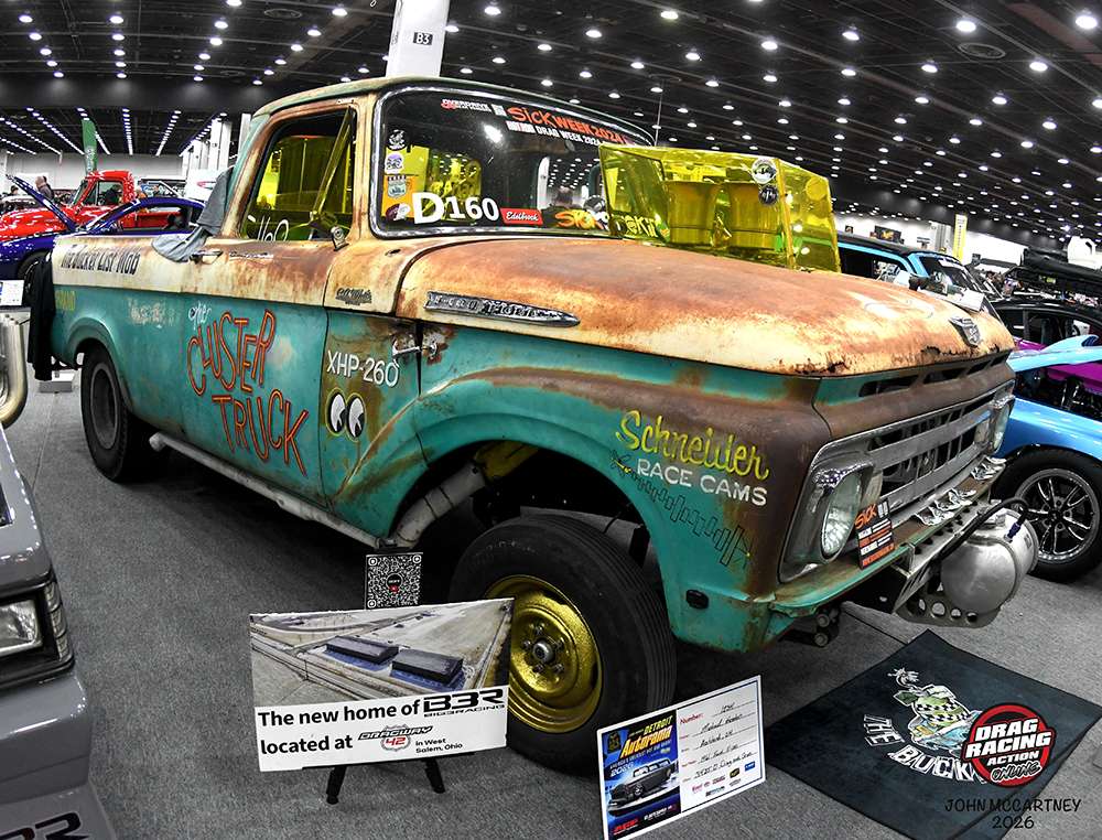 Michael Heaton runs his crazy 1961 Ford F-100 truck called Cluster Truck in the many SICK racing events.