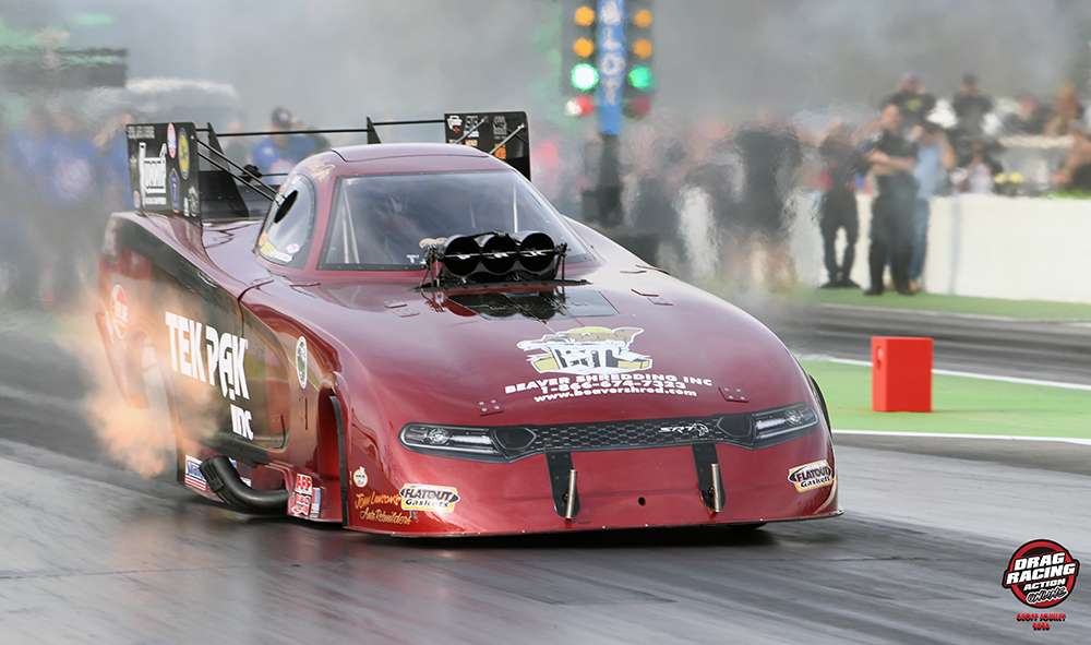 The eight-car field of Top Fuel was led by Jasmine Salinas, who laid down a blistering 3.004 at 285.59 mph. In the finals, it came down to the number one qualifier Salinas, and the number two qualifier, recently married Gary Pritchett from Elkton MD. Pritchett had an ever-so-slight advantage off the starting line, but Salinas went into instant smoke shutting off. Pritchett kept his foot in it kicking the rods out at the finish line in the win. Expensive way to take the green light, but worth it for the Foley Lewis Top Fuel team.