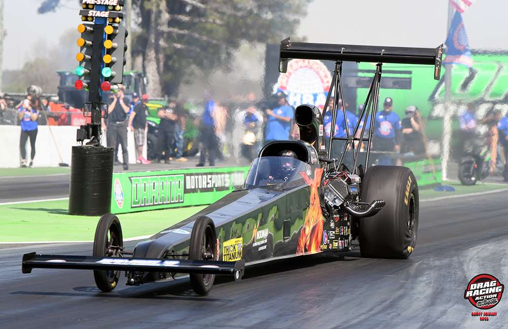 Austin left the line with a huge advantage. Shortly after the launch, Hill encountered severe tire shake and had to pedal the car multiple times in an attempt to recover. Unfortunately for Hill, Austin was on a clean pass and drove straight to the finish line and the winner’s circle. Austin ran 3.721 at 219.36 mph to Hill’s 5.023 at 104.33 mph.