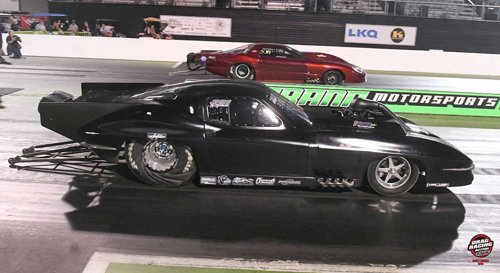 Out of the No. 6 slot, Haney in his Musi-powered “Black Widow” ’26 Corvette left first against Billy “The Kid” Albert and won with a 3.714 at 206.35 to Albert’s 3.747. He then lined up against another Brandon Switzer-tuned driver, Darlington winner “Mountain Man” Mike Achenbach, in the second round. Achenbach went red by .011, while Haney rolled to a 3.755 at 195.19. A timing system malfunction with the Christmas tree plagued the semifinal pairing between Haney and past Elite Top Sportsman world champion Buddy Perkinson. The issue caused Perkinson to leave the line late, but when he lost with a 3.691 at 204.79 to Haney’s 3.664 at 206.48, he declined the opportunity to rerun the race. Haney advanced to the final round with lane choice by five thousandths of a second.