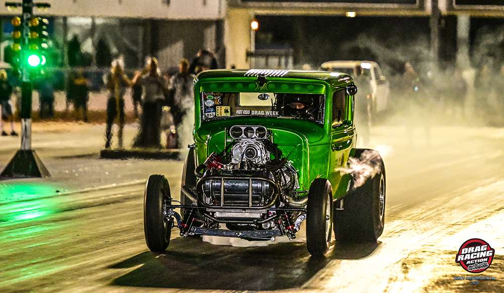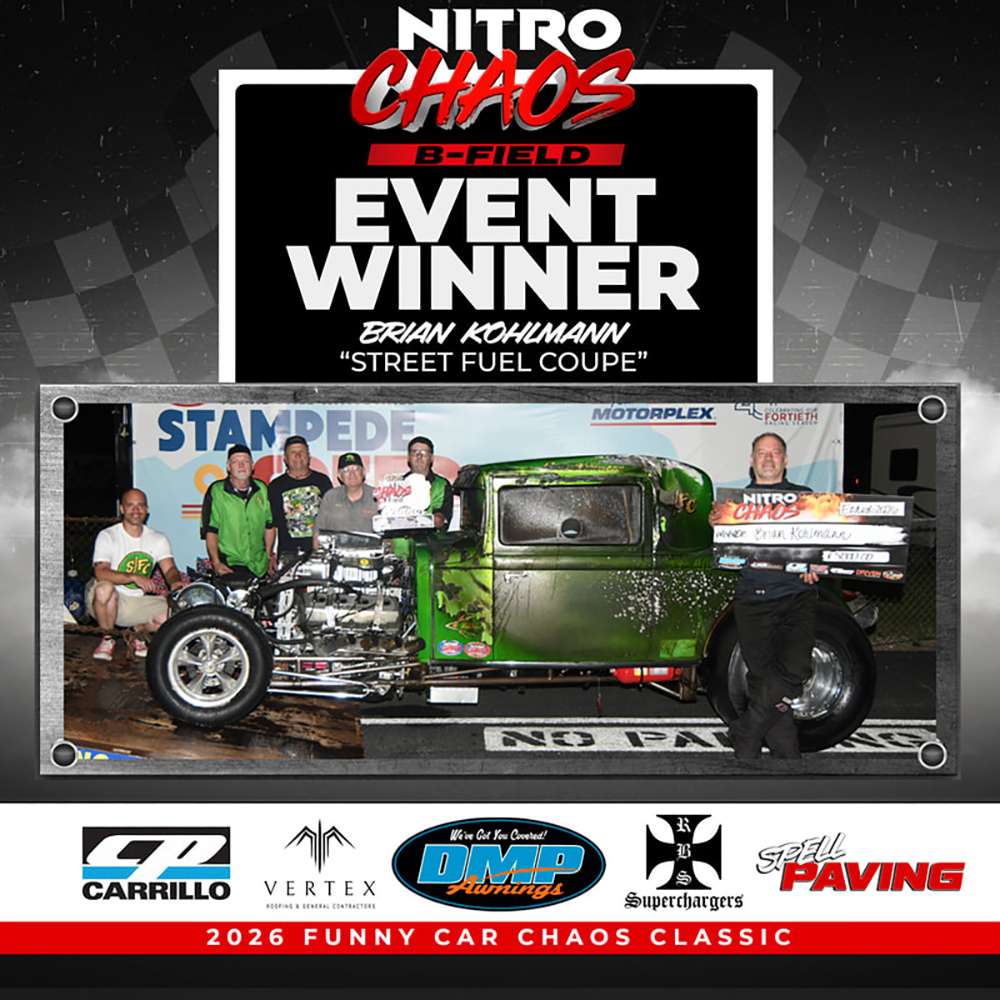 CP-Carrillo ‘B’ Field action welcomed Joe Kostelecky’s nostalgia top fueler and Brian Kohlmann’s “Street Fuel Coupe” to the line for the last CHAOS final round of the night. The cars were off the line together and immediately Kohlmann’s car was smoking heavily and as they neared the stripe Kohlmann took the win, the lost control in his own fluid and ended up on its side and on fire at the quarter mile mark. Thankfully CHAOS top end safety director Brad Thompson was perfectly positioned to extinguish the flames within literal seconds and Kohlmann was able to walk away from the very wild final round ride.