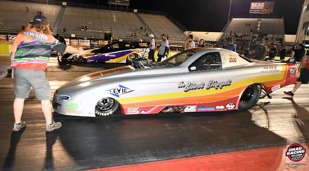 After qualifying was done Keith Zimmerer from Lindsay Texas drove his Mustang to the #1 spot at the Funny Car Chaos Classic ‘A’ field with a 3.59. The Texas Grim Reeper Mustang with Mary Reep behind the wheel was on the pole of the Alkydigger ‘B’ show with a 3.944., and Eureka Springs Arkansas racer Dan Cottrell in the ’69 Camaro Glass Chariot lead the Wulff Pump ‘C’ field with a 4.25.