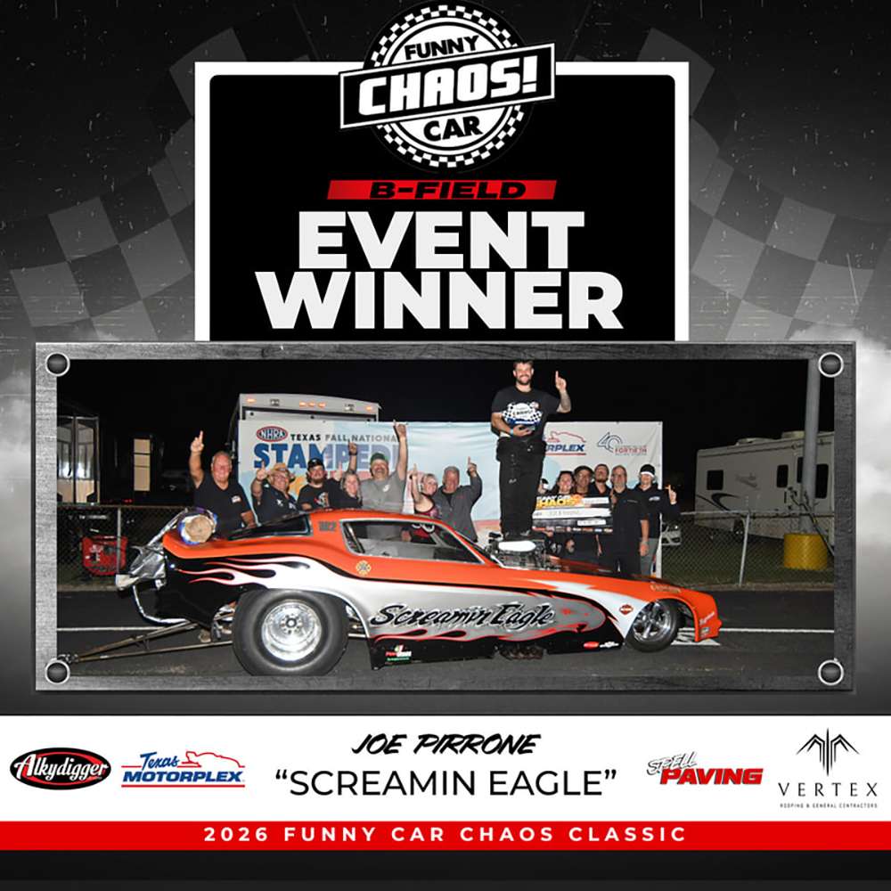 “Winning the Texas Motorplex Chaos event is like winning the Daytona 500 to us. I can thank my crew enough for all their hard work. My son Joey did a great job driving and tuning the Pirrone Racing Screamin Eagle to victory.”