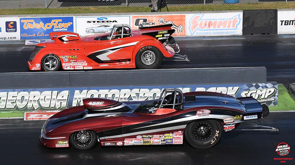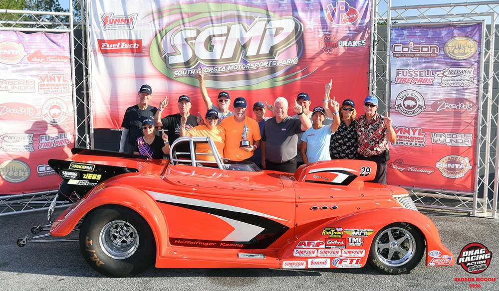 Jerry Heffelfinger from Englewood, Tenn. drove his ’38 Roadster to the Super Gas win over D4 driver Jim Repka. Heffelfinger, winning his second Lucas title, had the better light and ran a 9.925 on his 9.90 index as Repka from Wylie, Texas pushed his ’63 Corvette too quick running a  9.876 in the loss.